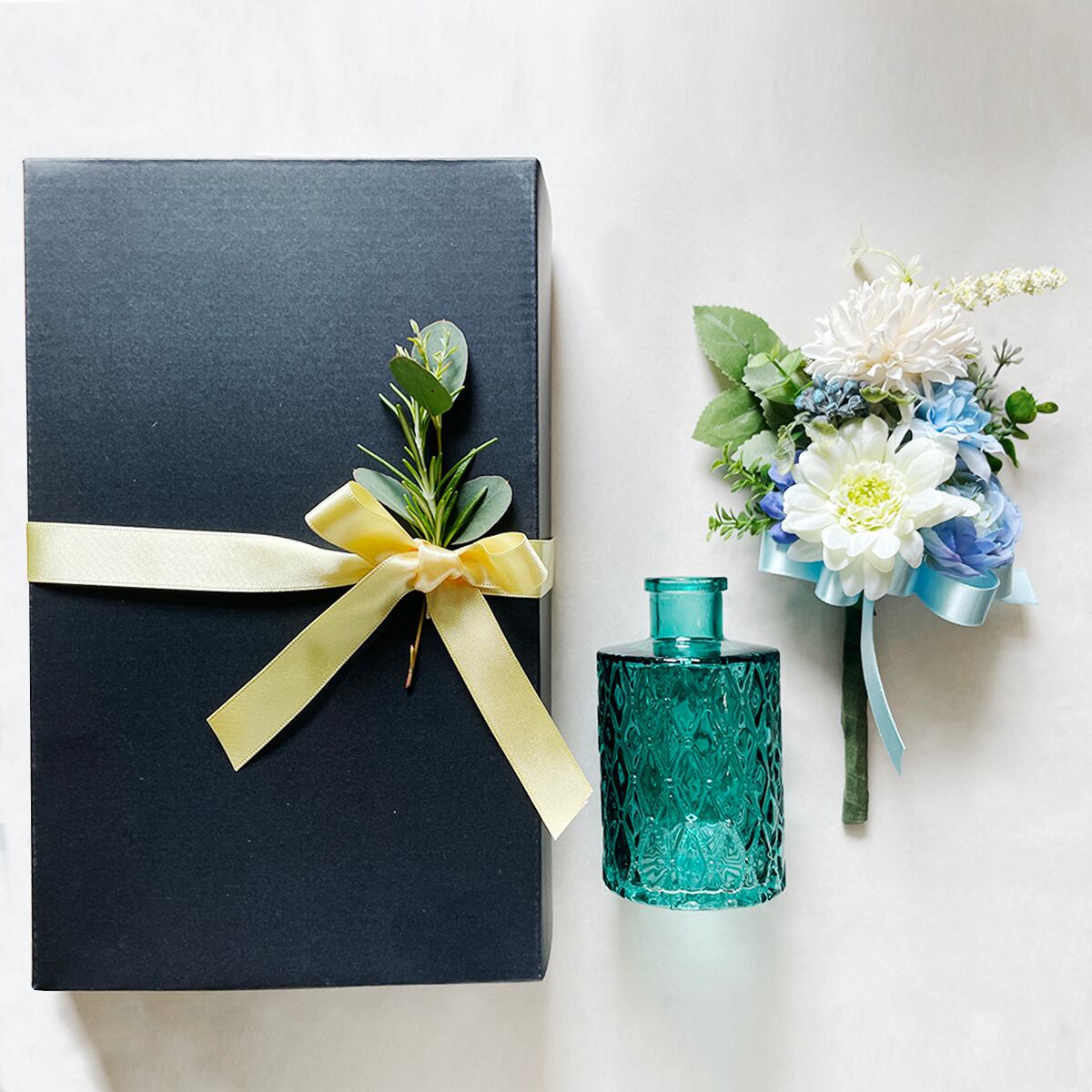ギフトに嬉しいボックス入りの優しい雰囲気の小さな造花ブーケと上品なガラスのフラワーベースをセットにしました。