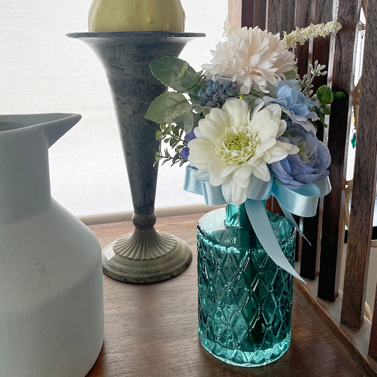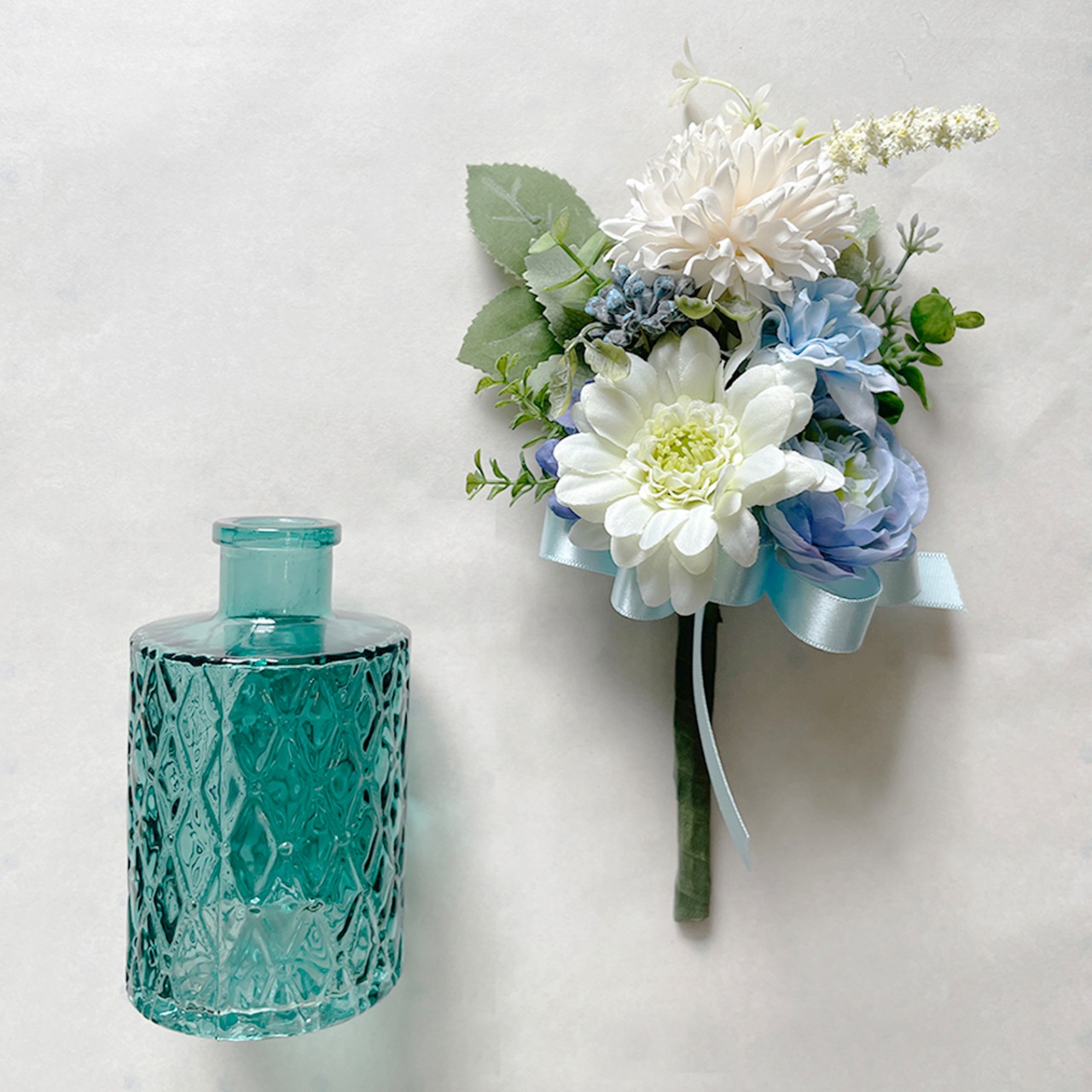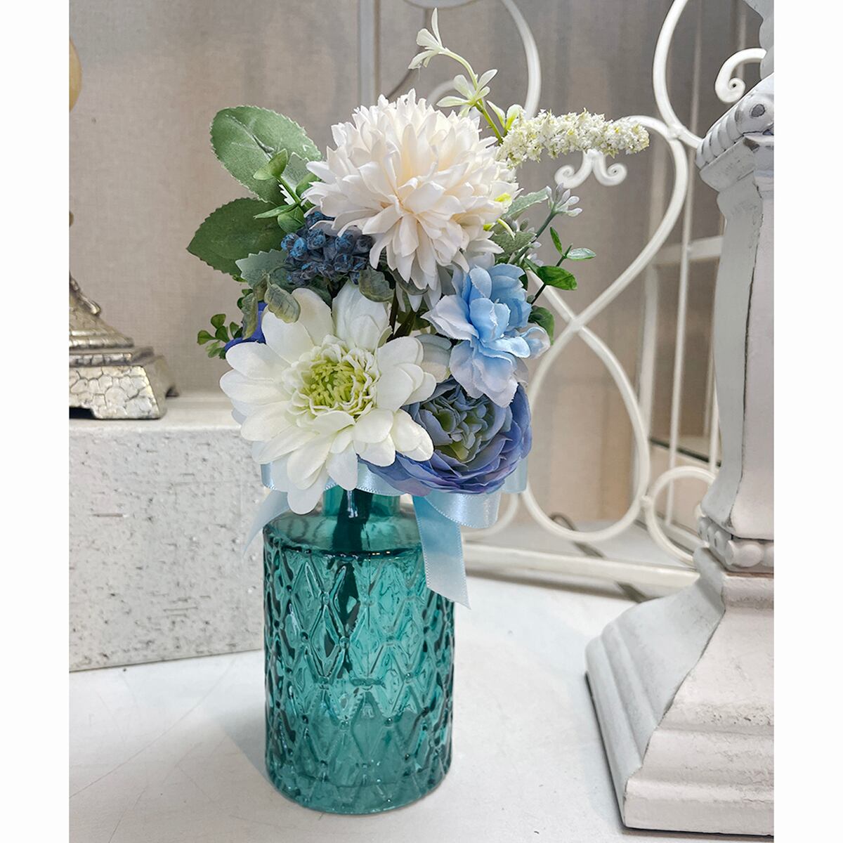 小さなフラワーベース付き造花ブーケのギフトセット ブルーホワイトブーケ×ブルーベース