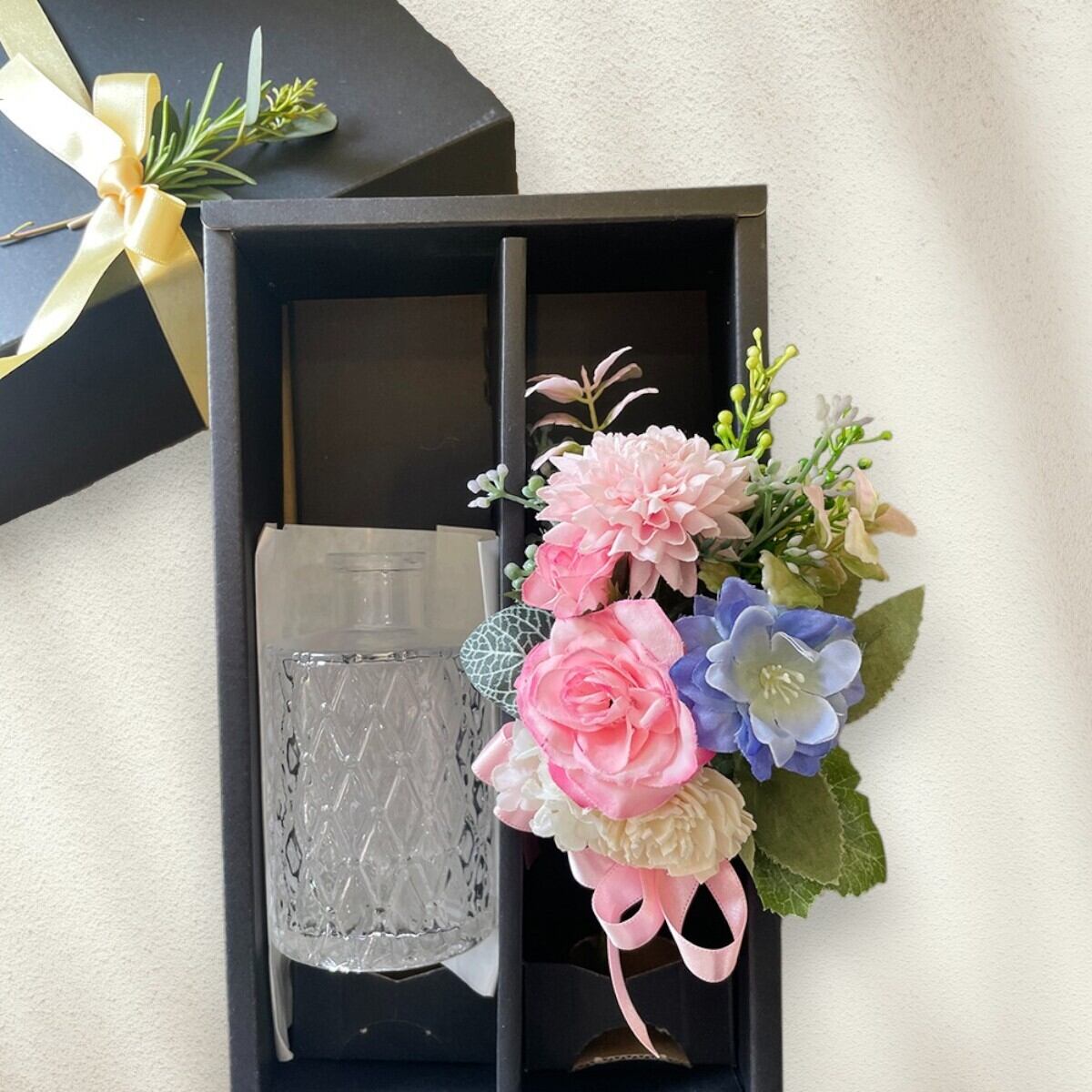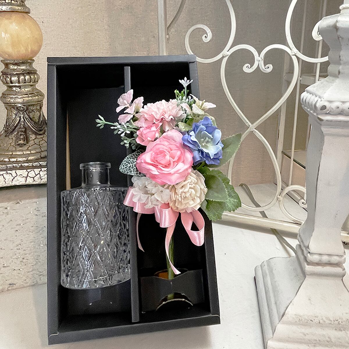 ギフトに嬉しいボックス入りの優しい雰囲気の小さな造花ブーケと上品なガラスのフラワーベースをセットにしました。